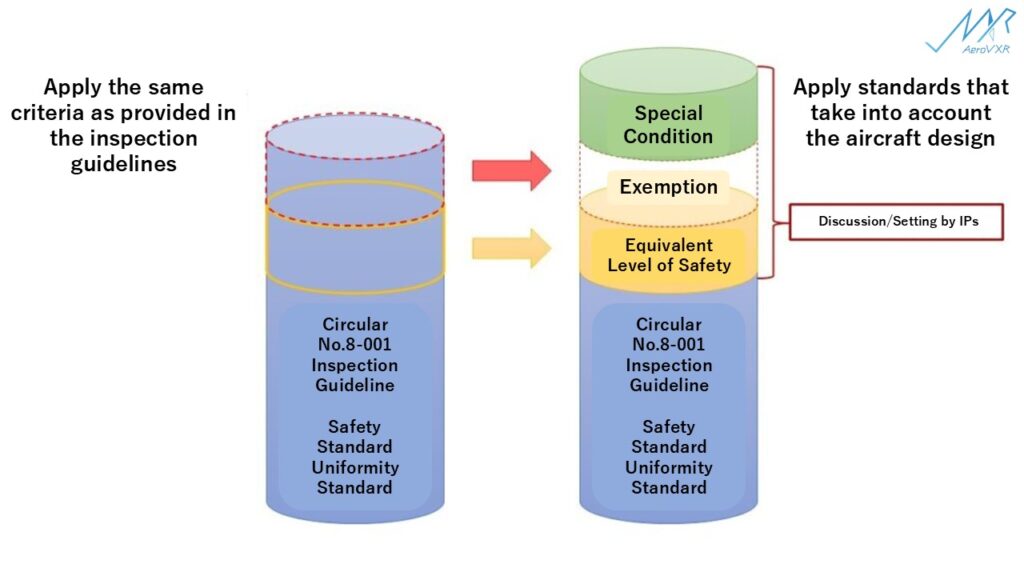However, special requirements may be established in addition to the Inspection Guideline as criteria for inspections pertaining to Type Certification when new technology is introduced into the design or when it becomes necessary to apply additional new criteria or methods to prove conformity to the standards in order to ensure safety, depending on the individual design. In addition, when it is judged that the application of some of the criteria is unnecessary or other methods are more appropriate due to the uniqueness of the design, etc., the criteria may be omitted (Exemption) or changed (Equivalent Level Of Safety).